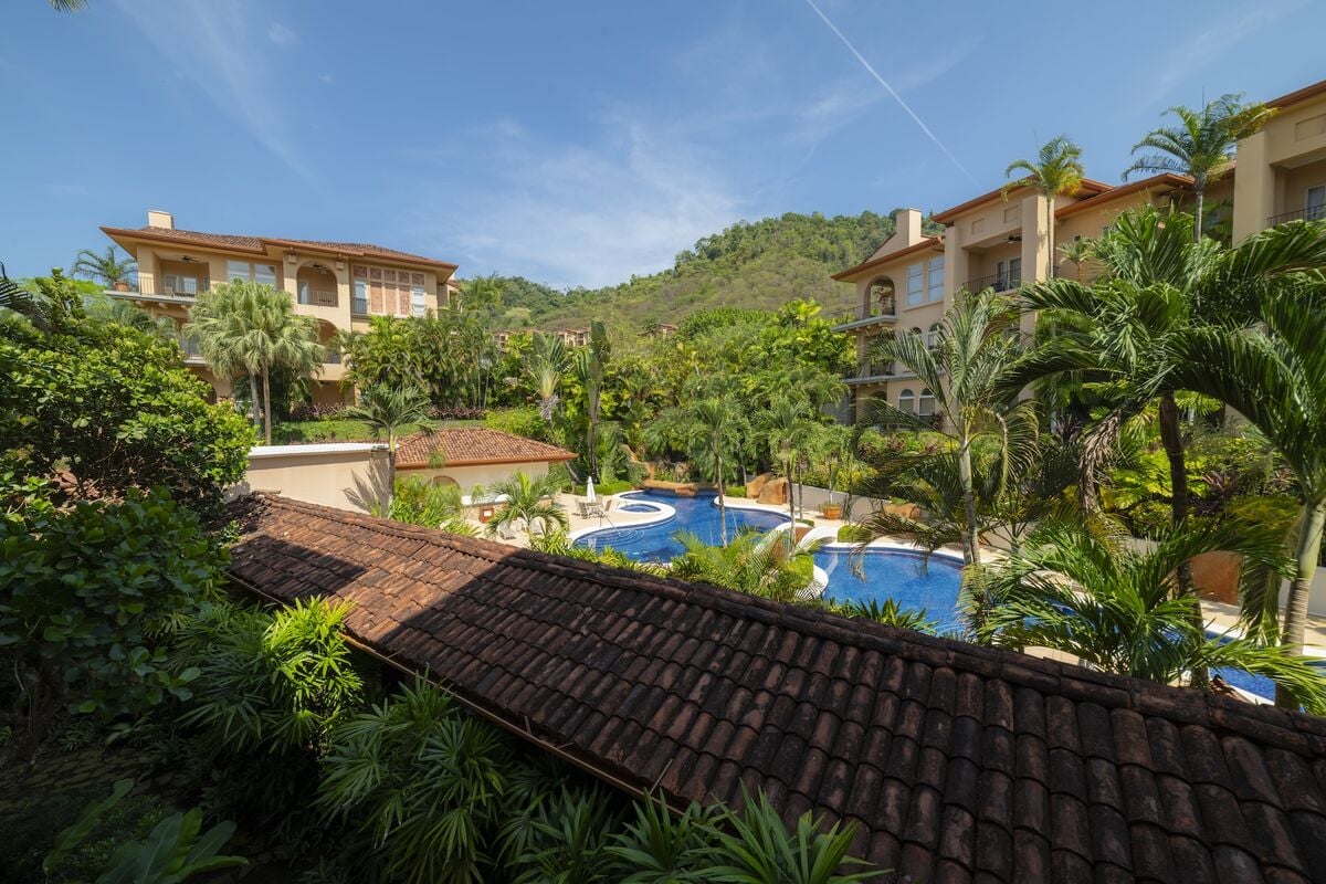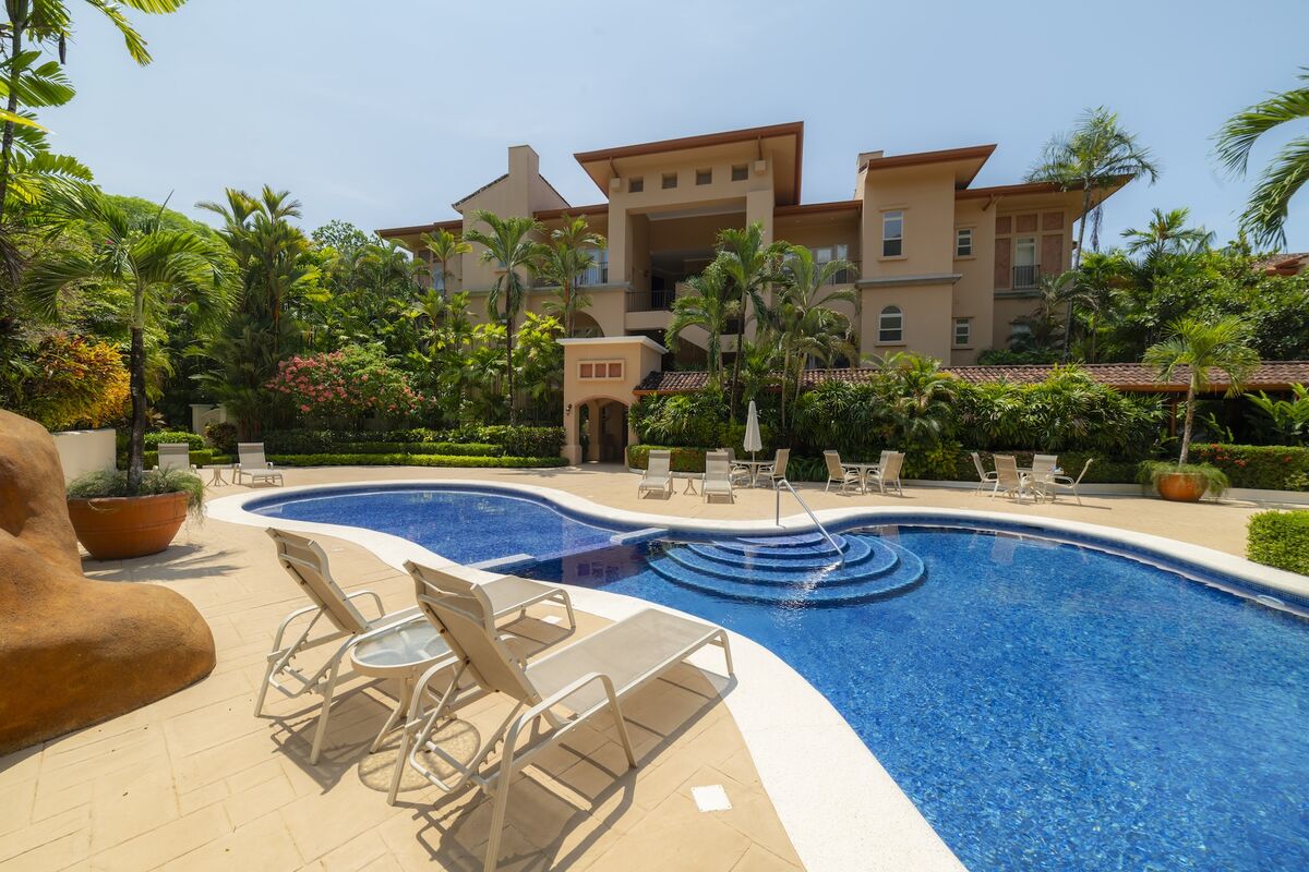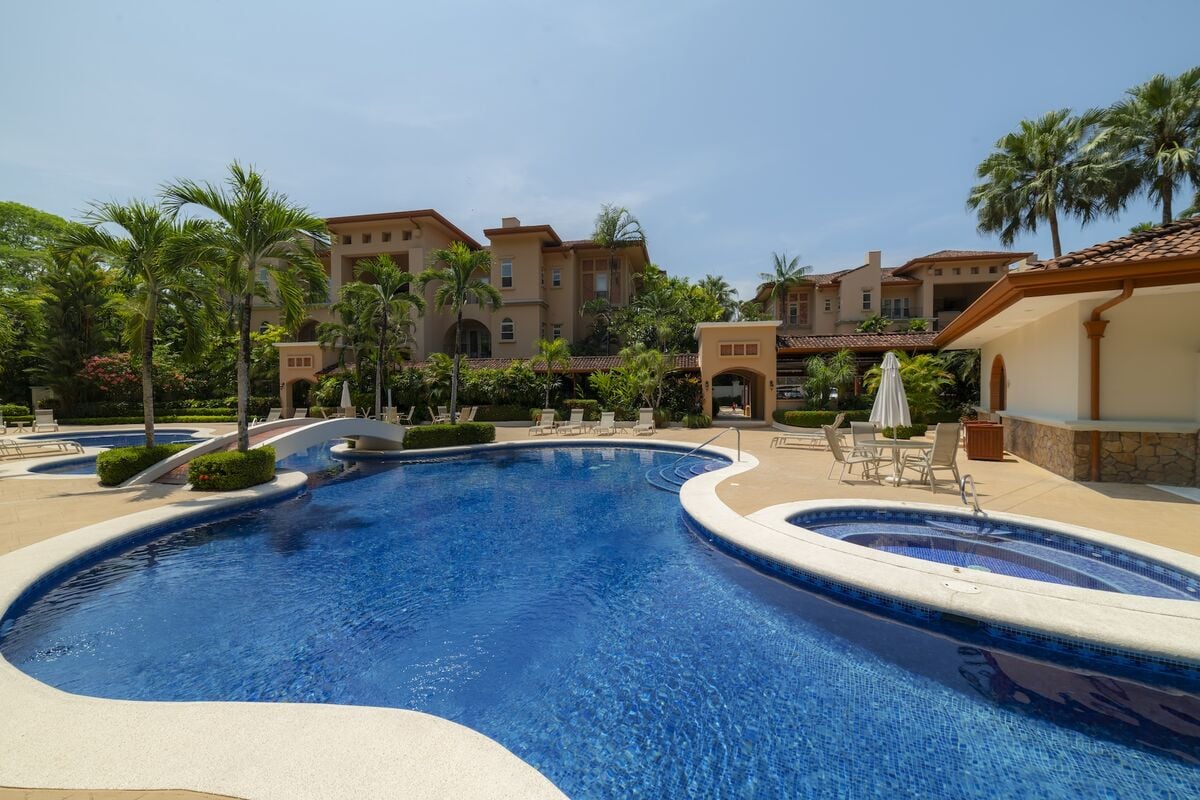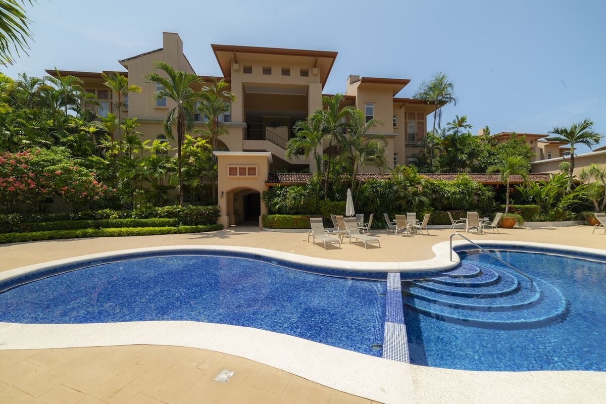 This luxurious 3,200 sq. ft. Spanish Mediterranean condo features 3 bedrooms and 3.5 bathrooms, offering ocean views and views of the exclusive Beach Club. Enjoy vaulted ceilings, Italian ceramic flooring, and spacious terraces. The gourmet kitchen and open-concept living area provide an ideal space for entertaining, while central air, a washer, and dryer add modern convenience. Experience true Costa Rican luxury in a beautiful, private setting.