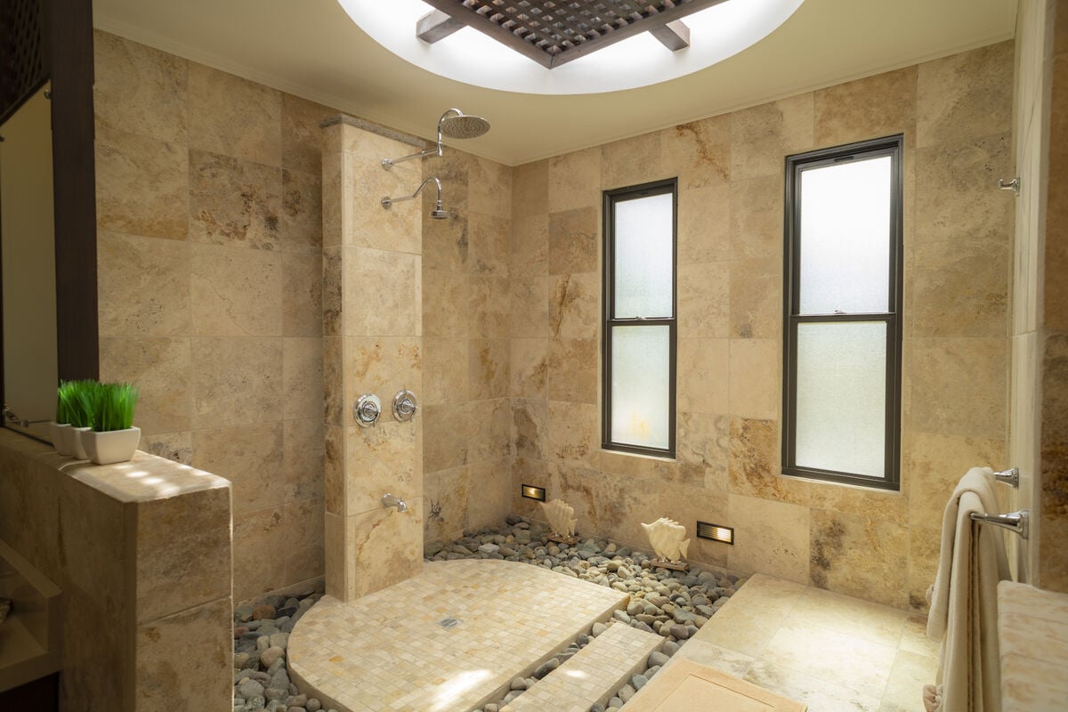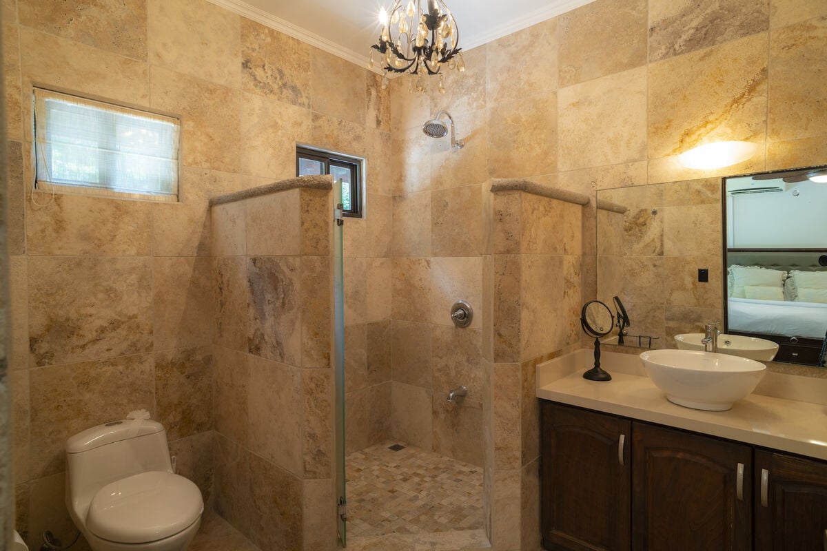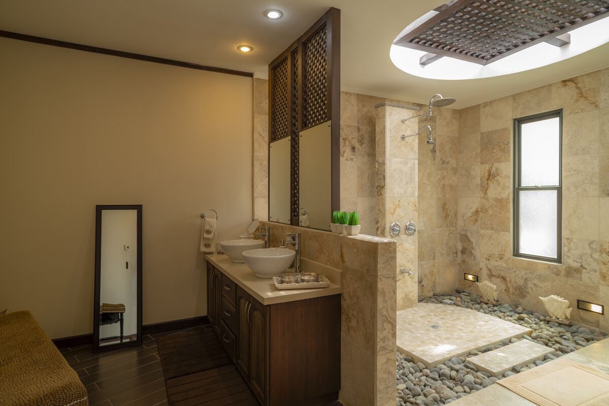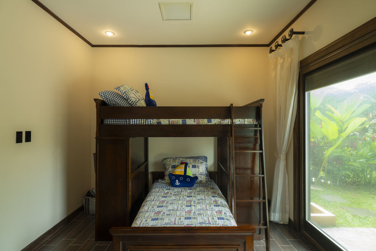 Each of the four bedrooms includes an en-suite bathroom with high-end finishes, premium bedding, flat-screen TVs, and calming jungle or garden views. The primary suite also offers a spa-style bath and a connected bedroom with two twin beds—perfect for guests traveling with children.